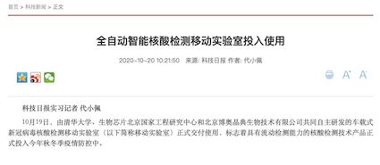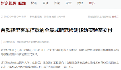 10月19日,“珠海市核酸檢測基地”在廣東省珠海市人民醫(yī)院正式揭牌啟用。揭牌儀式上,由清華大學(xué)、生物芯片北京國家工程研究中心和北京博奧晶典生物技術(shù)有限公司共同自主研發(fā)的首款輕型客車搭載的全集成新冠檢測移動實驗室正式亮相。