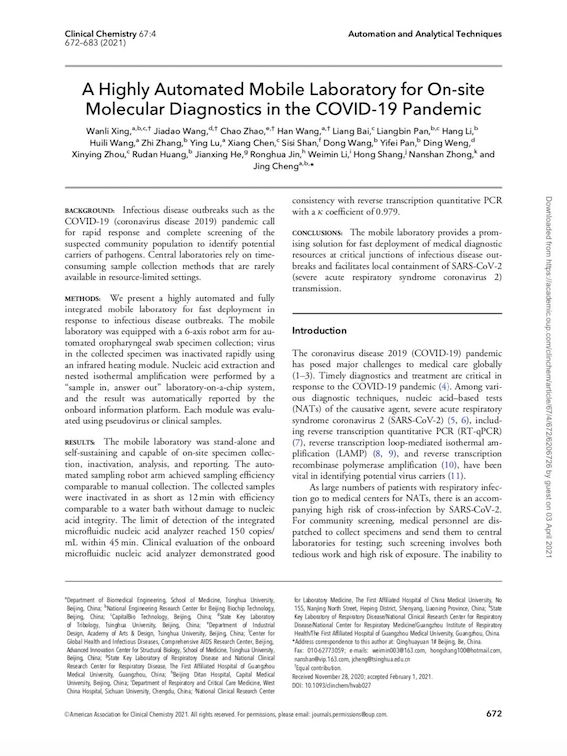 近日,博奧生物集團暨生物芯片北京國家工程研究中心攜手清華大學、廣州醫(yī)科大學第一附屬醫(yī)院呼吸系統(tǒng)疾病國家重點實驗室、國家呼吸系統(tǒng)疾病臨床研究中心、首都醫(yī)科大學北京地壇醫(yī)院、四川大學華西醫(yī)院、中國醫(yī)科大學第一附屬醫(yī)院國家檢驗醫(yī)學臨床研究中心等十多家單位,在國際檢驗醫(yī)學界權威雜志Clinical Chemistry,發(fā)表了題為"A Highly Automated Mobile Laboratory for On-site Molecular Diagnostics in the COVID-19 Pandemic"的研究論文,詳細闡述了“輕騎兵”全集成新冠病毒核酸檢測移動實驗室的性能特點和檢測能力等成果,得到了國內(nèi)外廣泛關注。