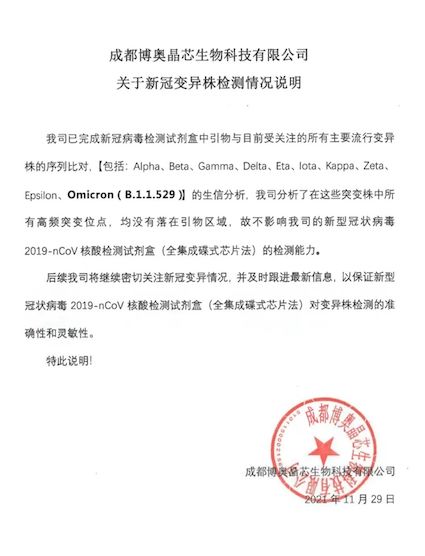 目前,旗下成都博奧晶芯生物科技有限公司已完成新冠病毒檢測(cè)試劑盒中引物與目前主要流行變異株的序列比對(duì)【包括但不限于:Alpha、Beta、Gamma、Delta、Eta、Iota、Kappa、Zeta、Epsilon、Omicron(B.1.1.529)】,結(jié)果證實(shí):博奧晶典已上市的新型冠狀病毒2019-nCoV核酸檢測(cè)試劑盒(全集成碟式芯片法),不會(huì)出現(xiàn)脫靶和漏檢的情況。后續(xù),博奧晶典將持續(xù)緊密追蹤全球新冠病毒變異株的最新動(dòng)態(tài)并及時(shí)跟進(jìn)最新信息,確保全集成新冠病毒核酸檢測(cè)芯片試劑盒對(duì)變異株檢測(cè)的準(zhǔn)確性和靈敏性。