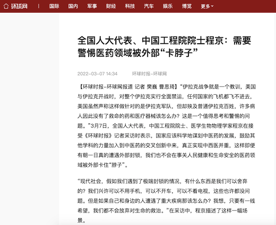 “伊拉克戰(zhàn)爭就是一個教訓(xùn),美國與伊拉克開戰(zhàn)時,對整個伊拉克實行全面禁運,任何國家的飛機都飛不進去,美國雖然聲稱這樣做針對的是伊拉克軍隊,但卻殃及普通伊拉克百姓,許多病人因此沒有了救命的藥和醫(yī)療器械該怎么辦?這是一個值得思考和警惕的問題?!?月7日,全國人大代表,中國工程院院士、醫(yī)學(xué)生物物理學(xué)家程京在接受《環(huán)球時報》記者采訪時表示,國家應(yīng)該科學(xué)地謀劃中醫(yī)藥的發(fā)展,鼓勵其他學(xué)科的力量加入到中醫(yī)藥的交叉創(chuàng)新中來,真正實現(xiàn)中西醫(yī)并重,這樣即便有朝一日真的遭遇外部封鎖,我們也不會在事關(guān)人民健康和生命安全的醫(yī)藥領(lǐng)域被外部卡住“脖子”。