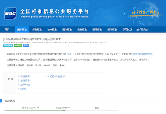 近日,國家市場監(jiān)督管理總局、國家標準化管理委員會發(fā)布《中華人民共和國國家標準公告》2022年第6號和第8號,由博奧生物集團有限公司主導制定的國家標準《微流控芯片核酸恒溫擴增儀技術要求》(GB/T 41407-2022),《多指標核酸恒溫擴增檢測微流控芯片通用技術要求》(GB/T 41521-2022)獲準頒布,分別于2022年4月15日、2022年7月11日起正式實施。兩項新標準的頒布完善了我國核酸擴增檢測技術領域的標準內(nèi)容,使相關技術所涉及產(chǎn)品應用與服務更加規(guī)范、具有較強的指導性。