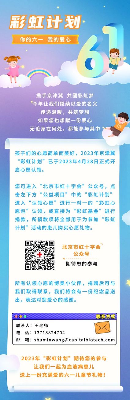 為了更好地關(guān)心、關(guān)愛(ài)血液病患兒,使更多人了解和加入造血干細(xì)胞捐獻(xiàn)公益事業(yè),2009年中華骨髓庫(kù)和新京報(bào)聯(lián)合發(fā)起了“你的六一,我的愛(ài)心”公益活動(dòng),呼吁全社會(huì)關(guān)注血液病兒童,為他們送上小小的兒童節(jié)禮物,讓他們感受到來(lái)自陌生人的溫暖。此后的每一年,北京市紅十字會(huì)和志愿者把這個(gè)公益項(xiàng)目延續(xù)至今。2016年起,京津冀三地紅十字會(huì)、志愿者和愛(ài)心人士一起以“攜手京津冀、共圓彩虹夢(mèng)”為主題,將這個(gè)項(xiàng)目發(fā)展、壯大。