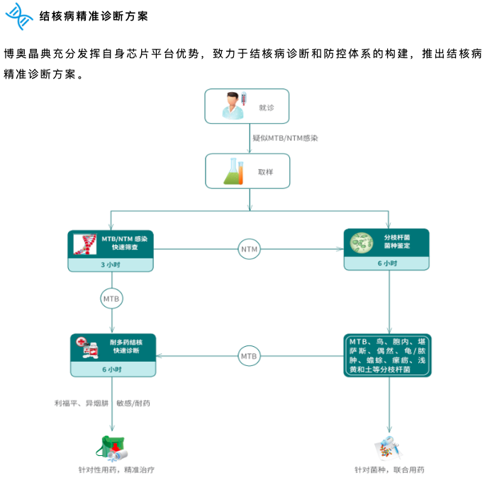 結(jié)核病精準(zhǔn)診斷方案中包含:分枝桿菌核酸檢測(cè)試劑盒(PCR-熒光探針?lè)ǎ?、分枝桿菌菌種鑒定試劑盒(DNA微陣列芯片法)、結(jié)核分枝桿菌耐藥基因檢測(cè)試劑盒(DNA微陣列芯片法)。這三款診斷產(chǎn)品,環(huán)環(huán)相扣,涵蓋了結(jié)核快速篩查、菌種鑒定、耐多藥結(jié)核病快速診斷,構(gòu)成了晶芯®結(jié)核病快速分子診斷系統(tǒng)。結(jié)核診斷、輔助用藥全面覆蓋,真正實(shí)現(xiàn)結(jié)核全程分子監(jiān)控。