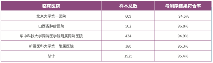 1925 例來自北京大學第一醫(yī)院、山西省腫瘤醫(yī)院等醫(yī)療機構的臨床樣本使用 HPV 檢測試劑盒檢測結果表明:對于 HPV 感染陽性的樣本,芯片檢測結果與 DNA 測序結果比較,符合率在 95% 以上。